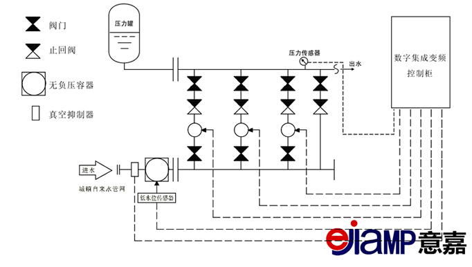 意嘉EJGW無(wú)負(fù)壓供水設(shè)備又稱之為疊壓供水設(shè)備,是以自來(lái)水為水源,充分利用自來(lái)水管網(wǎng)本身壓力,實(shí)現(xiàn)“差多少,補(bǔ)多少”的連續(xù)增壓的供水方式。在設(shè)備入口管道上串接一個(gè)壓力罐,對(duì)市政管網(wǎng)起到緩沖補(bǔ)償作用,并用以防止產(chǎn)生負(fù)壓,從而防止對(duì)市政管網(wǎng)造成過(guò)度抽吸。