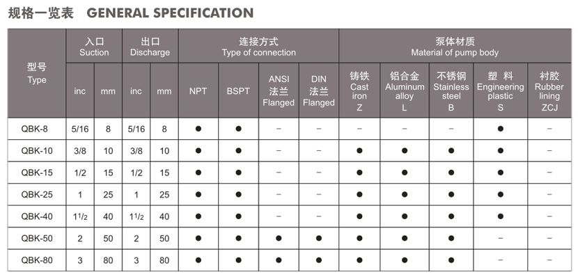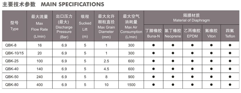 QBK第三代氣動隔膜泵規(guī)格表: