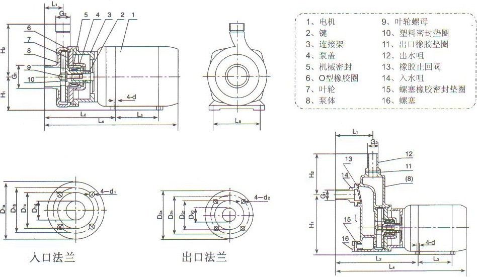2、機(jī)械密封:靜環(huán):陶瓷(SiC)。動(dòng)環(huán)石墨浸漬呋喃樹脂。
