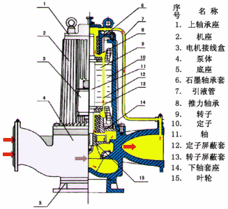結(jié)構(gòu)見(jiàn)圖。該泵為機(jī)泵一體結(jié)構(gòu),整機(jī)主要由泵體、葉輪、聯(lián)接體、滑動(dòng)軸承、定子、轉(zhuǎn)子、屏蔽套、電機(jī)殼等零部件組成。泵為立式單級(jí)單吸離心式,進(jìn)出口在同一水平軸線上,口徑規(guī)格相同可直接象閥門(mén)一樣安裝在管路的任何部位上,裝卸極為方便,占地面積省。泵通過(guò)聯(lián)接體與電機(jī)或一體,軸承采用進(jìn)口石墨浸漬樹(shù)脂復(fù)合軸承,電子定轉(zhuǎn)子各有屏蔽套進(jìn)行隔離。軸承采用流體本身介質(zhì)作為潤(rùn)滑劑及冷卻液,具有設(shè)計(jì)合理、運(yùn)行可靠的特點(diǎn)。泵設(shè)有底座,可直接安裝在地基上,因該泵具有低噪音,無(wú)振動(dòng)特點(diǎn),安裝時(shí)無(wú)需加裝隔振器或隔振墊。
