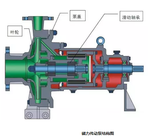 磁力泵由三部分組成:泵,磁力驅(qū)動器和電機(jī)。 磁驅(qū)動器的關(guān)鍵組件由一個外磁轉(zhuǎn)子,一個內(nèi)磁轉(zhuǎn)子和一個非磁隔離偏置組成。當(dāng)電動機(jī)帶動外磁轉(zhuǎn)子旋轉(zhuǎn)時,磁場會穿透氣隙和非磁性物質(zhì),并帶動與葉輪相連的內(nèi)磁轉(zhuǎn)子同步旋轉(zhuǎn)實現(xiàn)動力的非接觸式傳輸,將動密封變成靜密封。由于泵軸和內(nèi)磁轉(zhuǎn)子完全