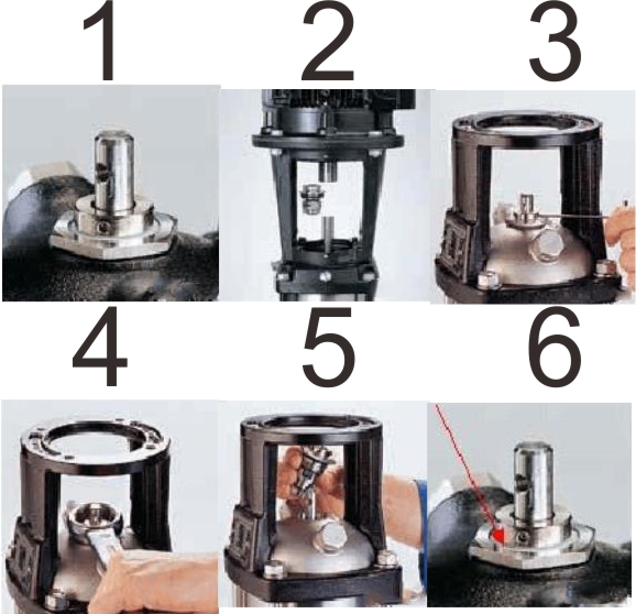 6.重新定位機械密封后,請按照步驟 4、3 和 2 固定機械密封。 動環(huán)固定好后,先裝電機,再固定聯(lián)軸器。在固定聯(lián)軸器之前,請記住用提供的機械密封墊將軸抬起一定距離,否則旋轉(zhuǎn)將不靈活和穩(wěn)定。 在箭頭所指位置,用機械密封墊將靜環(huán)抬升到一定位置,一般為1-2mm,以保持軸處于懸空狀態(tài),以便靈活轉(zhuǎn)動。 如果沒有墊片,可以用其他1-2mm墊片均勻墊兩邊。