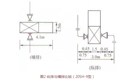 縱向排列時水泵各機組軸線平行,如圖1所示??v向排列結(jié)構(gòu)緊湊,電動機抽軸方便,建筑面積小,但泵房跨度大,管件多,水力條件較差,一般需要橋式吊車吊裝。縱向排列適用于如IS單級單吸懸臂式離心泵。因為懸臂式泵系頂端進水,采用縱向排列能使吸水管保持順直狀態(tài)(圖1中的泵1)。如果泵房中兼有側(cè)向進水和側(cè)向出水的離心泵(如圖1中泵2均系SH型或SA型泵),則縱向排列的方案就值得商榷。如果SH型泵占多數(shù)時,縱向排列方案就不可取。例如20SH-9型泵,縱向排列時,泵寬加上吸壓水口的大小頭和兩個90°彎頭長度共計3.9m(圖2)。如果作橫向排列,則泵寬為4.1m,其寬度并不比縱排增加多少,但進出口的水力條件卻大為改善,在長期運行中可以節(jié)省大量電耗。