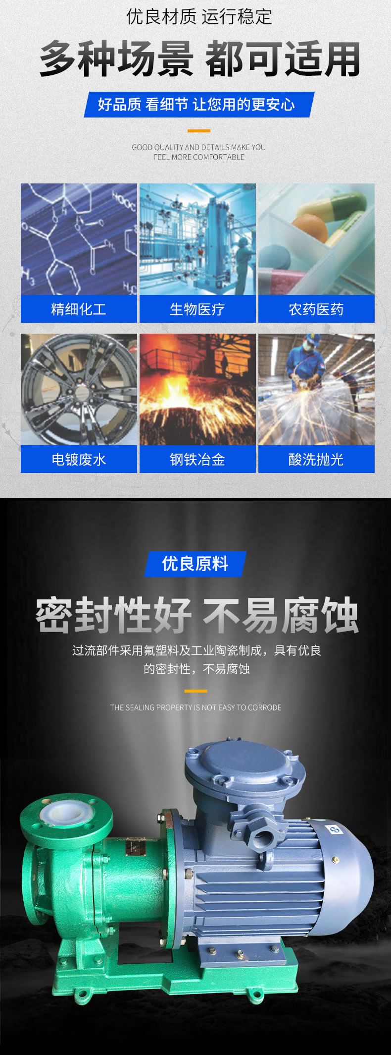 堅固耐用的泵體結構雖然接觸液體部分是氟塑料,但泵外殼是金屬材料,故泵體足以承受管道的重量及抵受機械性沖擊。