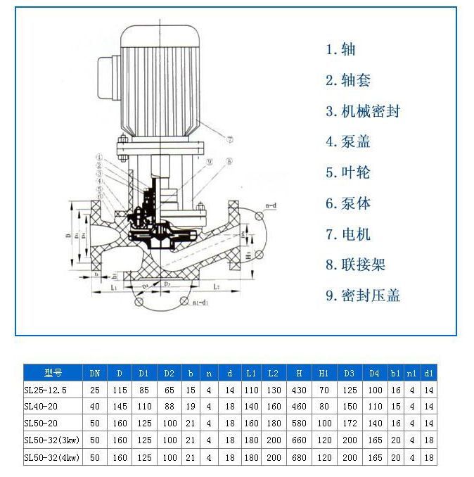 1 軸 2 軸套 3 機械密封 4 泵蓋 5 葉輪 6 泵體 7 電機 8 聯(lián)接架 9 密封壓蓋