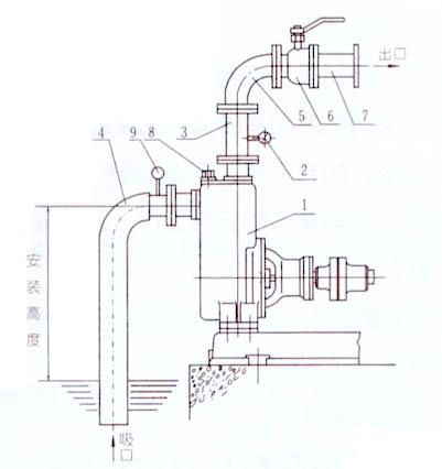 a. 吸入口的安裝高度不能超過5米,在條件許可時,吸入口的安裝高度應盡可能地低于水池最低的儲水平面,并盡量縮短吸入管的長度,少裝彎頭,這樣有利于縮短自吸時間,提高自吸功能。