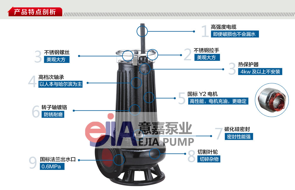 ejiamp/意嘉牌化糞池無堵塞排污泵是有電機(jī)、蝸殼泵體、開式帶刀葉輪等主要部件組成,意嘉泵業(yè)生產(chǎn)的WQK化糞池?zé)o堵塞排污泵具有排污通過能力特別強(qiáng),帶切割性能好,能將污水中的長纖維、塑料、紙、帶、布條、稻草、繩子等雜質(zhì)切碎后排出,采用最先進(jìn)的方法,設(shè)計(jì)成最合理的水力特性,使電泵可以全揚(yáng)程運(yùn)行,優(yōu)良的干式電機(jī)和水泵的最佳組合,使電泵的總效率達(dá)到西德abs公司的ass帶切割裝置系列產(chǎn)品相同,排污泵采用高質(zhì)量的硬質(zhì)合金,雙端面機(jī)械密封和骨架油封組面部位,不得超過電動機(jī)高度的1/2,抽送污物溫度不超過40℃。優(yōu)點(diǎn):WQX系列污水污物潛水排污泵主要用于排送生活廢水、污水、人糞尿及含有短纖維紙屑、木屑、淀粉、泥沙、礦石粒等固體懸浮物和非腐蝕性介質(zhì),被抽送液體溫度不超過40℃,密度不大于1200kg/m3,ph值~9。該電泵采用雙端面機(jī)械密封和旋轉(zhuǎn)葉輪,葉輪采用不銹鋼、耐磨損、不堵塞、不纏繞、具有體積小、結(jié)構(gòu)緊湊、攜方便等優(yōu)點(diǎn)。