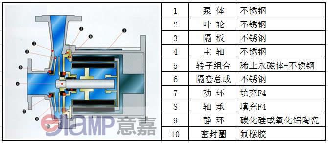 意嘉泵業(yè)生產(chǎn)的ejiamp牌100CQ-50磁力驅(qū)動泵是利用永磁聯(lián)軸器工作原理無接觸的傳遞扭矩的新型泵,當(dāng)原動機(jī)帶動外磁鋼轉(zhuǎn)子時,通過磁場的作用驅(qū)動內(nèi)磁鋼轉(zhuǎn)子同步旋轉(zhuǎn),而內(nèi)磁鋼轉(zhuǎn)子和葉輪連成一體,從而達(dá)到無接觸帶動葉輪轉(zhuǎn)動之目的。由于液體被封閉在靜止的隔離套內(nèi),所以磁力泵是一種全封閉、無泄漏的泵型,因此完全杜絕了機(jī)械密封離心泵不可避免的跑、冒、滴、漏的弊病。