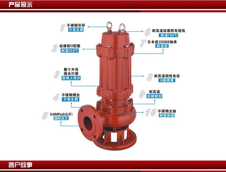 耐高溫污水泵是上海意嘉泵業(yè)研發(fā)生產(chǎn)的一種WQR型高溫排污泵,耐高溫污水泵可用于熱水池中的污水排放及鍋爐水池循環(huán)排放。此款產(chǎn)品具有抽送介質(zhì)溫度高、安裝移動方便、高效節(jié)能、防纏繞、無堵塞等特點??捎糜谳斔秃畚?、固體顆粒、纖維的高溫液體介質(zhì)。眾所周知目前市面上的排污泵只能輸送介質(zhì)溫度為常溫或40℃以內(nèi)的介質(zhì),我們上海意嘉泵業(yè)生產(chǎn)的這款WQR耐高溫潛水排污泵就很好解決了一些用戶介質(zhì)溫度在40-100℃度之間不能使用潛水排污泵只能改過其它類型水泵的問題。