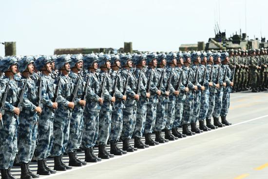 7月30日,慶祝中國(guó)人民解放軍建軍90周年閱兵在位于內(nèi)蒙古的朱日和訓(xùn)練基地舉行。中共中央總書(shū)記、國(guó)家主席、中央軍委主席習(xí)近平檢閱部隊(duì)并發(fā)表重要講話。這是受閱部隊(duì)接受檢閱。